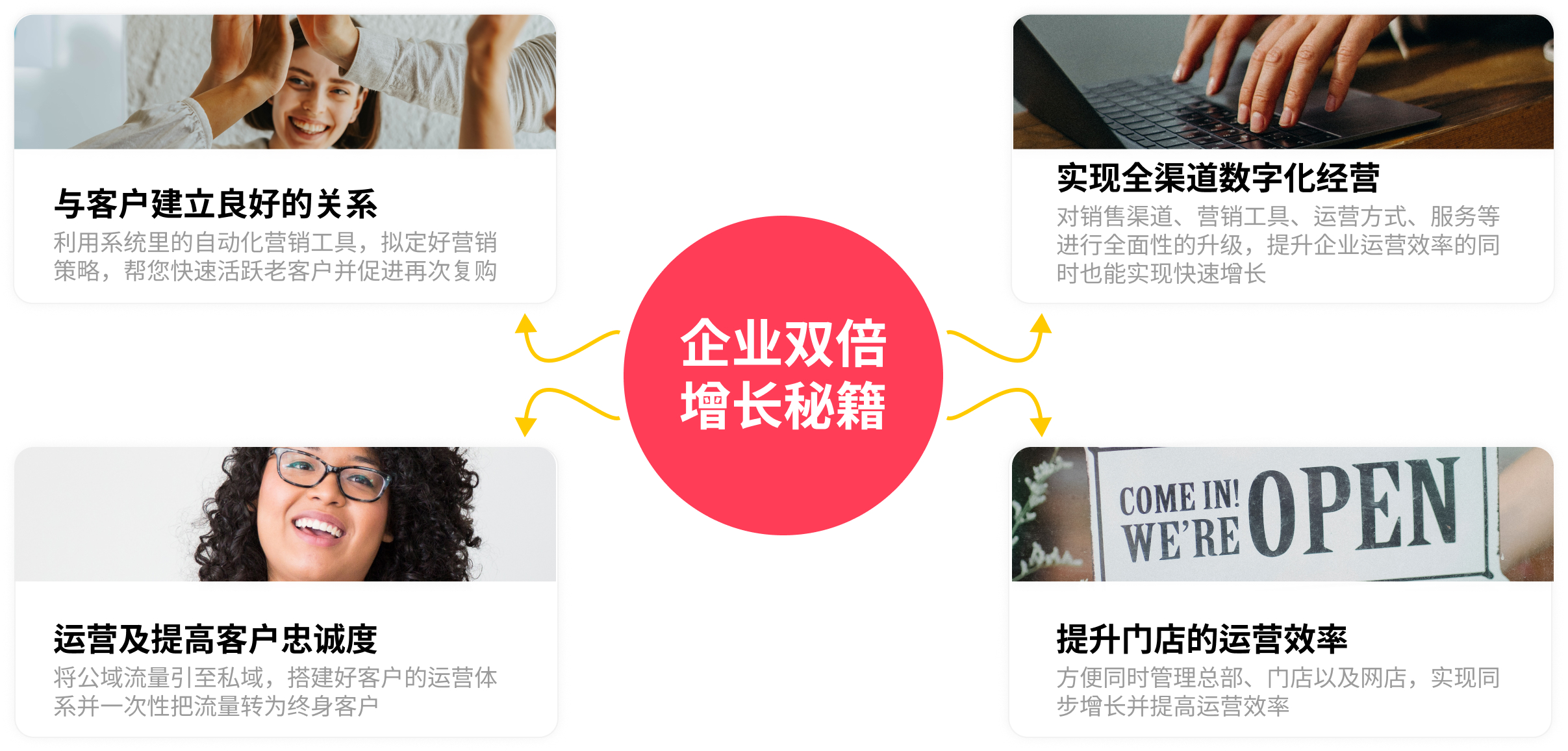 对销售渠道、营销工具、运营方式、服务等进行全面性的升级,提升企业运营效率的同时也能实现快速增长
